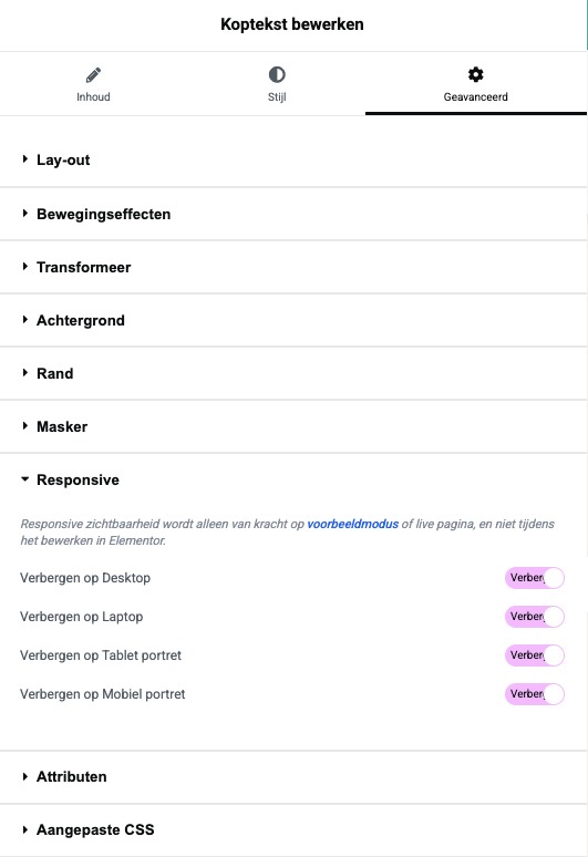 Om dit blok hier boven te activeren, doe het volgende: Typ de nodige tekst in DAT vlak > Ga boven het tekstvlak naar “Geavanceerd” > Scoll naar beneden naar het tabje “Responsive” > Vink ze allemaal uit (als ze paars zijn zijn ze verborgen, als ze grijs zijn is het zichtbaar op de website).